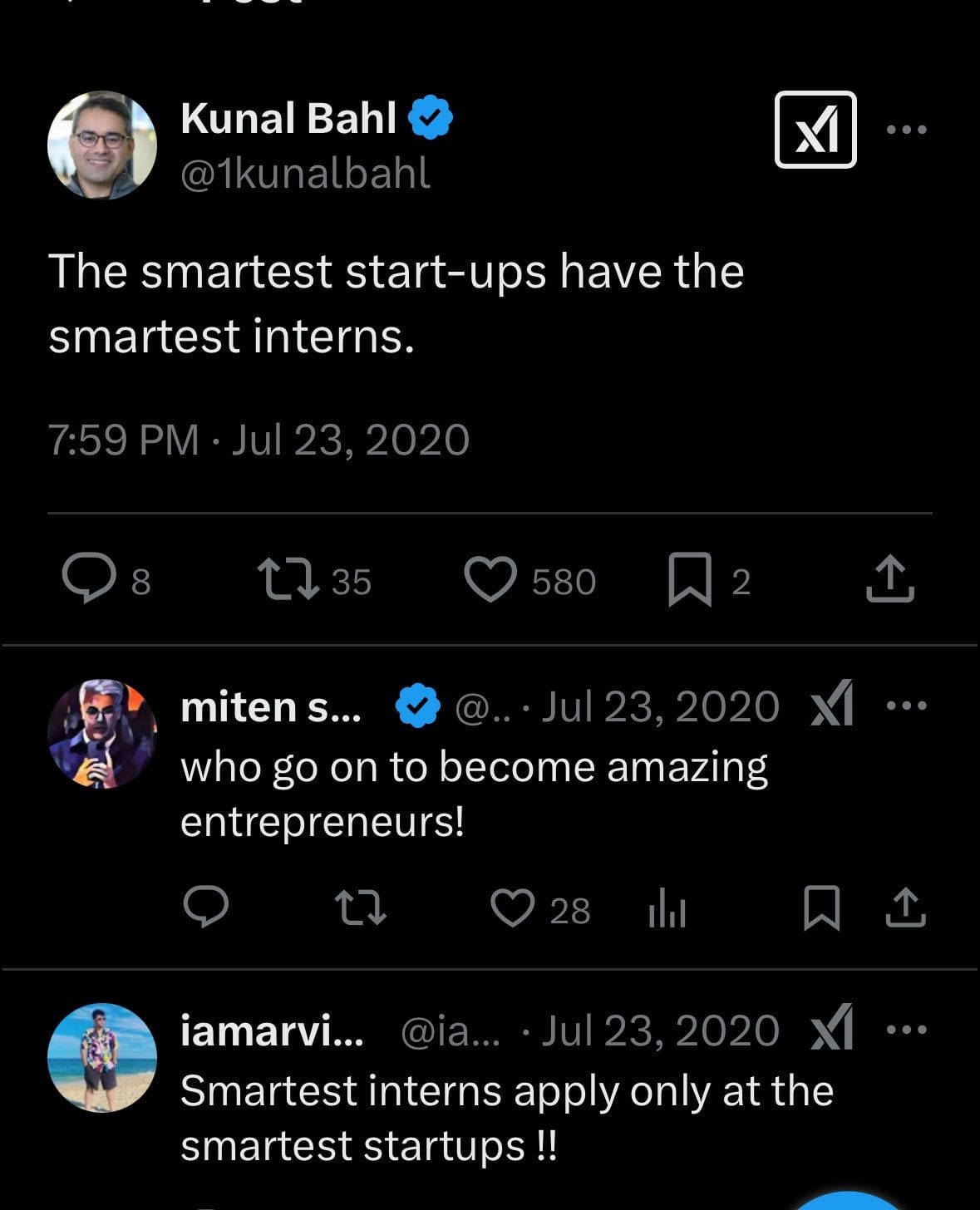 I first came across this thought at a conference in 2015, where Kunal Bahl, the founder of Snapdeal and Titan Capital in a conversation with Shradha Sharma, founder of YourStory said something along the lines of “The quality and velocity of a startup is a function of the interns it attracts”. It’s been close to a decade to that event and I do hope he’ll pardon the paraphrase, but the essence of his statement stuck with me years after I heard it.